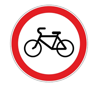 Велосипедпен жүруге тыйым салынады «Велосипедпен жүруге тыйым салынады» белгісі тыйым салу белгілерінің қатарына жатады. Велосипедпен жүруге тыйым салатын белгінің суреті қарастырылып отырған топқа тән шеңбер формасына ие: ақшыл фонда қызыл жиегі бар велосипедтің силуэті салынған.